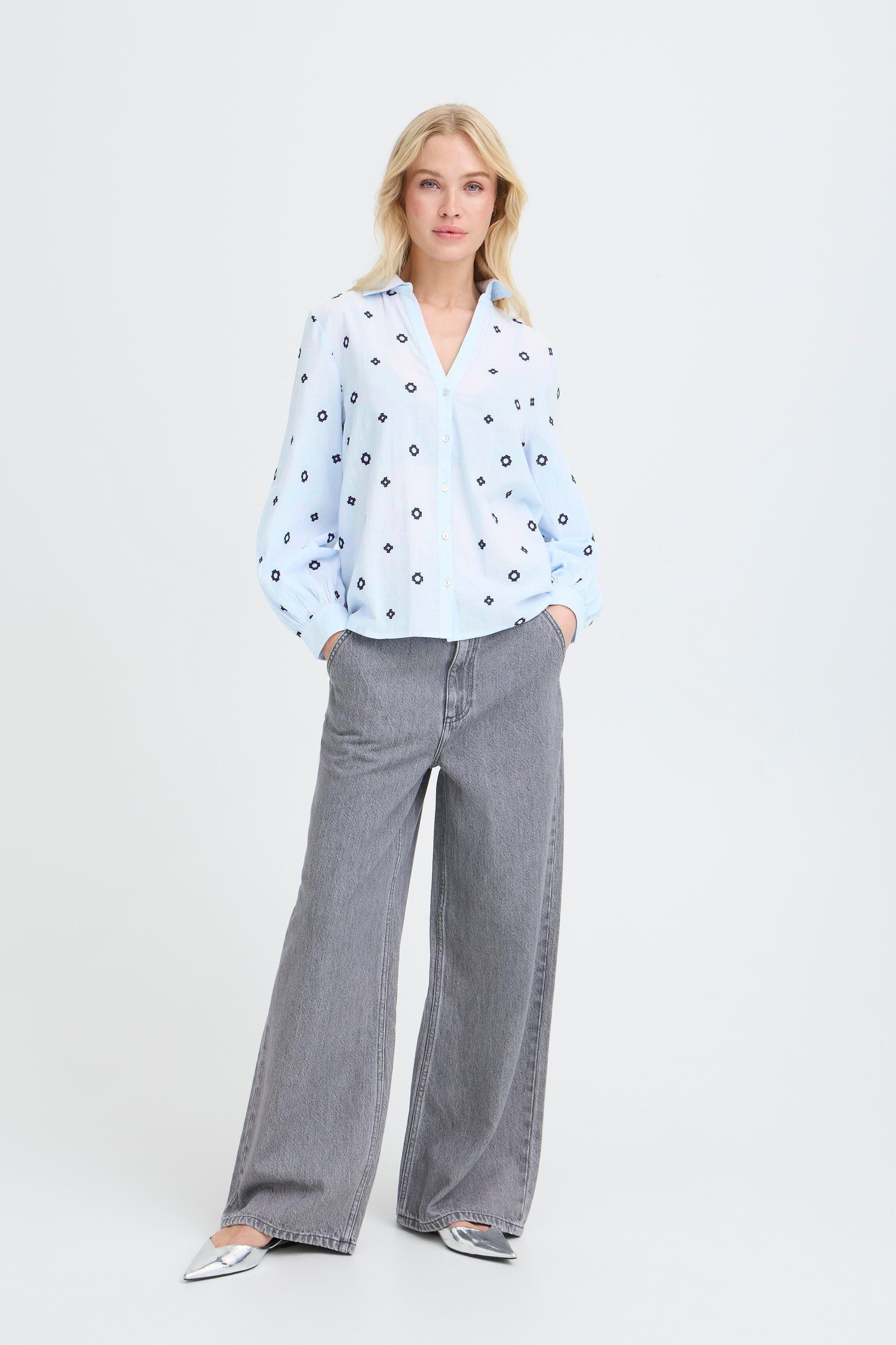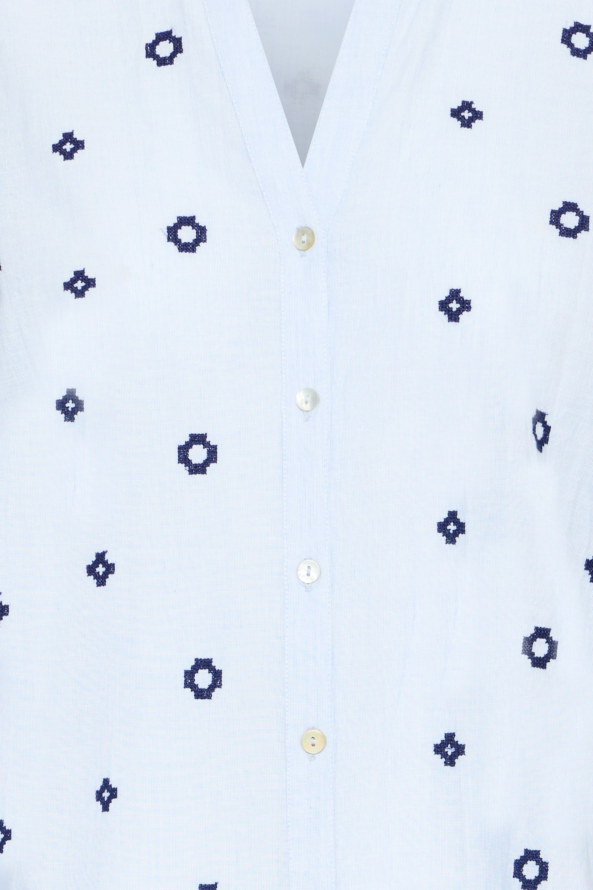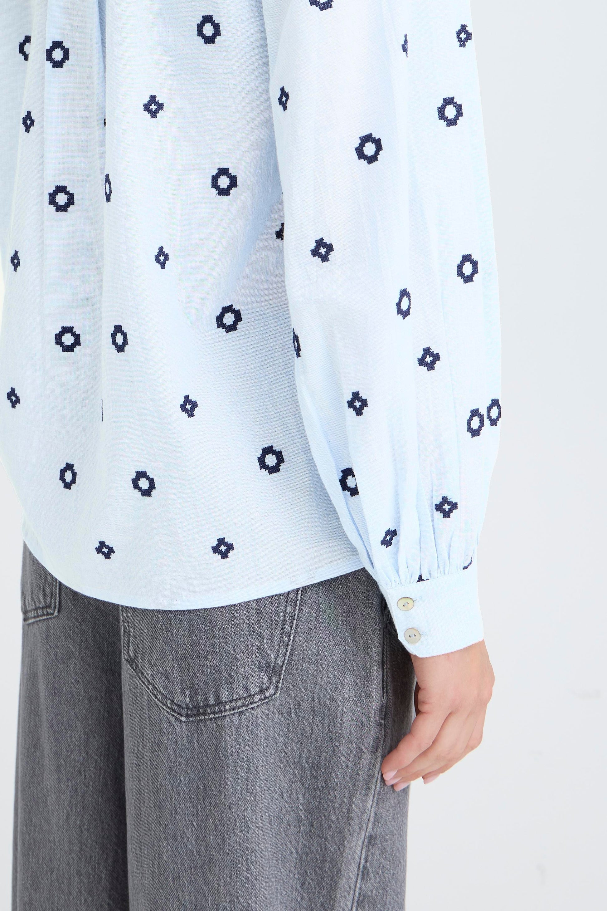 This embroidered blouse features a straight silhouette with a slightly rounded, longer back hem. The design includes a pointed collar, V-neckline, and full-length sleeves with wide cuffs. The blouse closes with a button front.