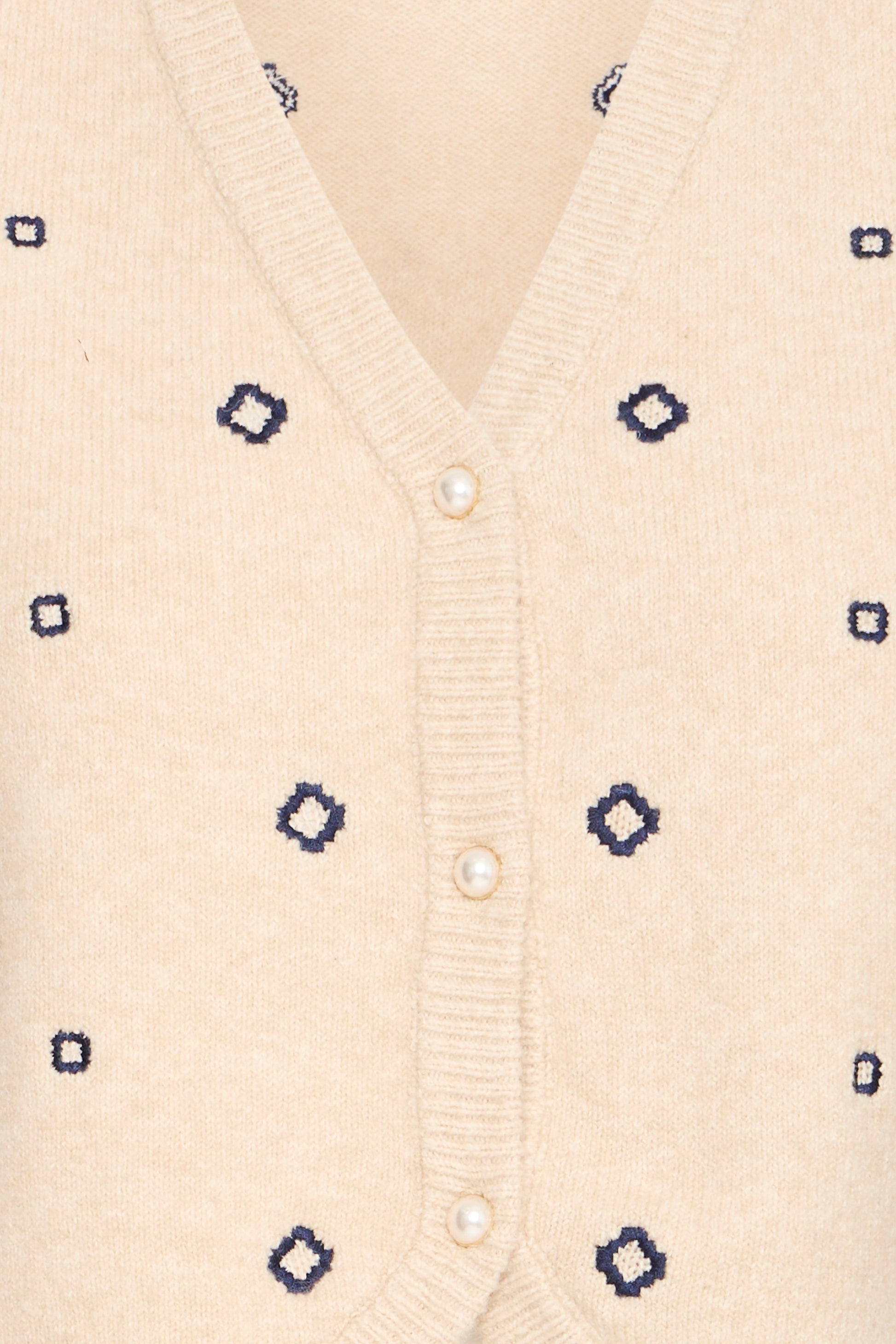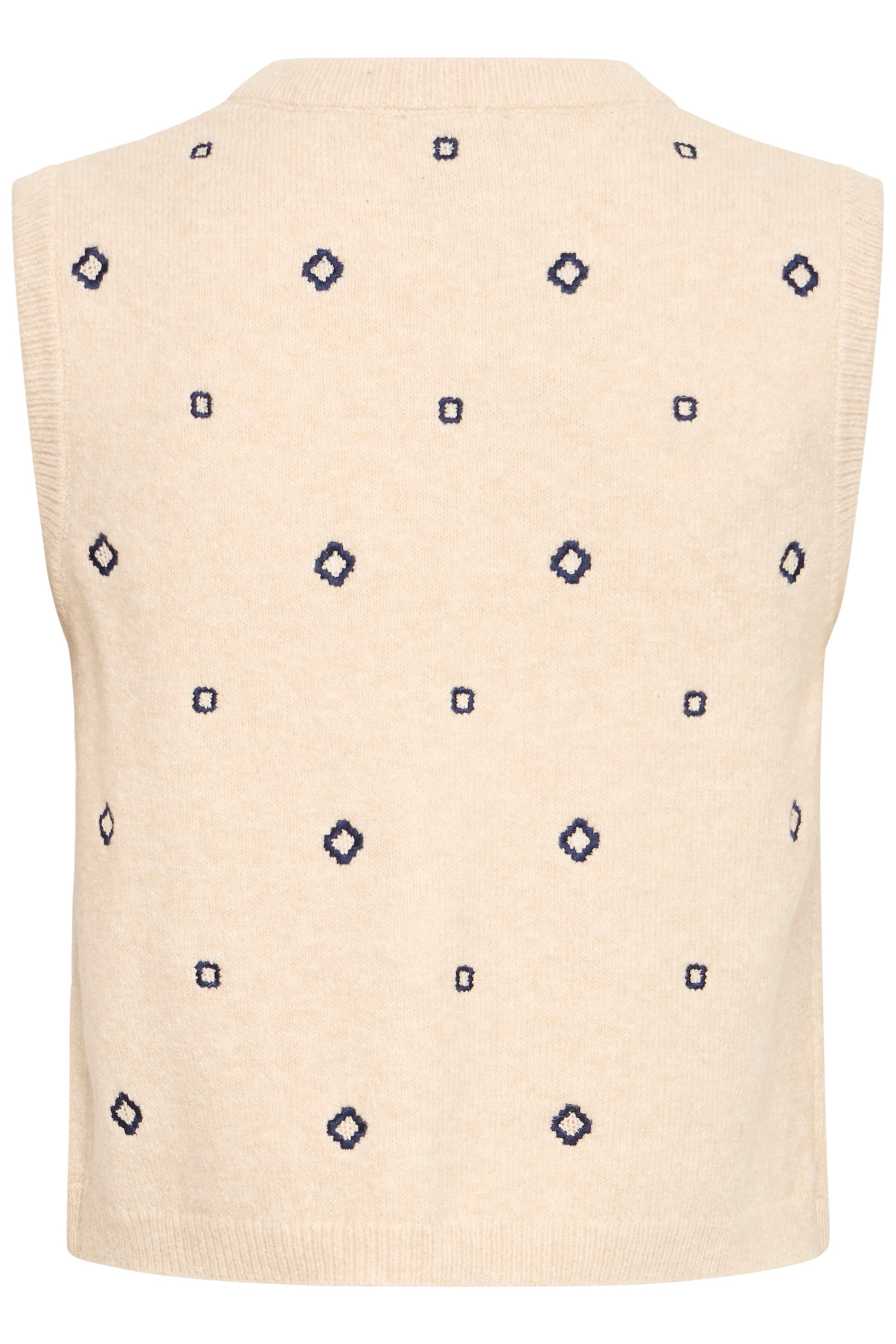 This buttoned vest features a fitted silhouette with a deep V-neckline and sleeveless design. Decorative geometric details are visible across the entire vest, which has a soft texture and ribbed edges at the hem, neckline, and placket.