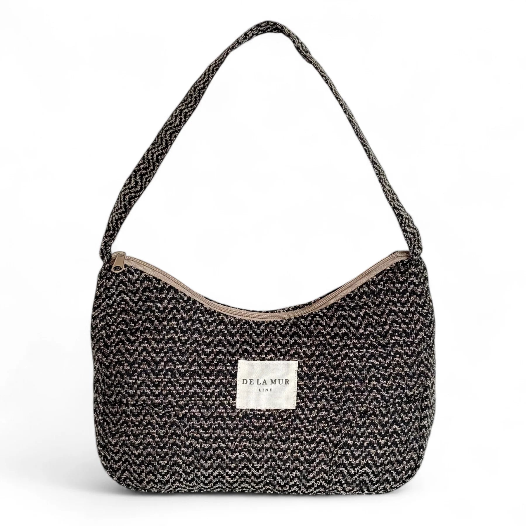 Small shoulder bag with a fabric handle. Top zip closure. Made from thick jacquard fabric with a black and beige zigzag pattern. Lined with thick gray fabric. Interior zip pocket. For proper care, hand wash in cold water and do not tumble dry.