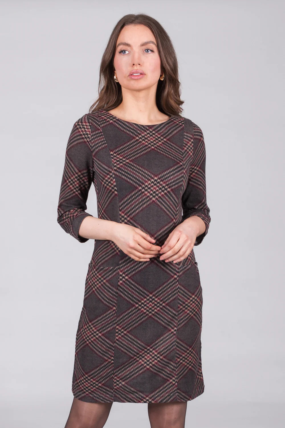 This tartan-inspired knit dress features a structured silhouette and an all-over geometric motif, ideal for both professional and casual settings. The mid-length cut and 3/4 sleeves offer a sleek, sophisticated look, while the side pockets add practicality. Made from soft jersey stretch fabric, it delivers comfort without compromising style. A timeless piece that delivers effortless elegance.